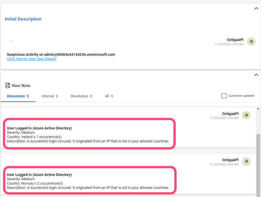 We then auto-generated a service ticket titled 'Octiga Alert Activity for admin@M365x44144236.onmicrosoft.com' with a suffix of a list of country code(s) to indicate where these activities happened from. (Ex. ["IE","NO"])