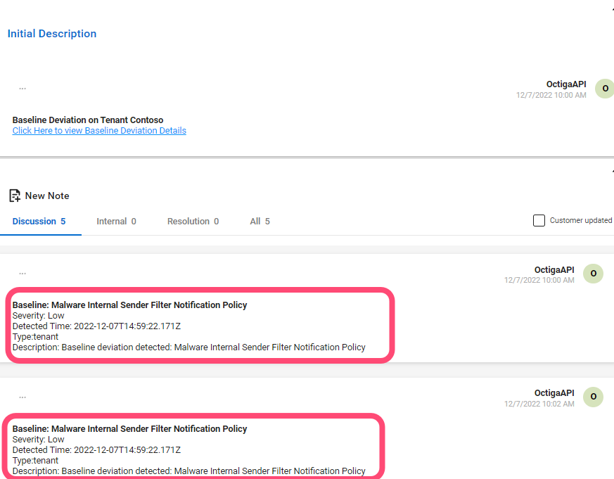 For Example, we detected baseline deviations from one of your onboarded 365 client tenants called Contoso. We then auto-generated a service ticket titled 'Octiga Alert Baseline Deviation on Tenant Contoso'.