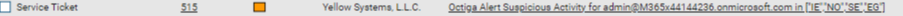 We then auto-generated a service ticket titled 'Octiga Alert Activity for admin@M365x44144236.onmicrosoft.com' with a suffix of a list of country code(s) to indicate where these activities happened from. (Ex. ["IE","NO"])