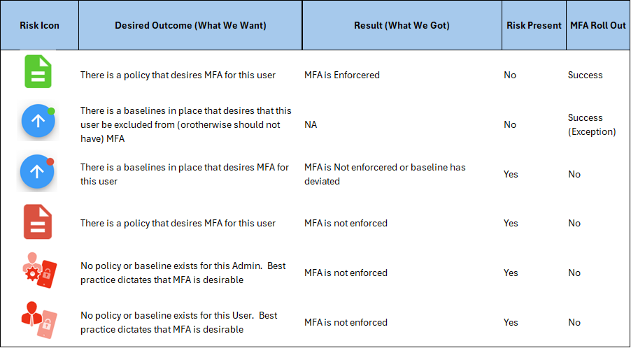 You can use the MFA Account Risks to Evaluate Which Users are at risk regardless of desired MFA Settings and Baselines.