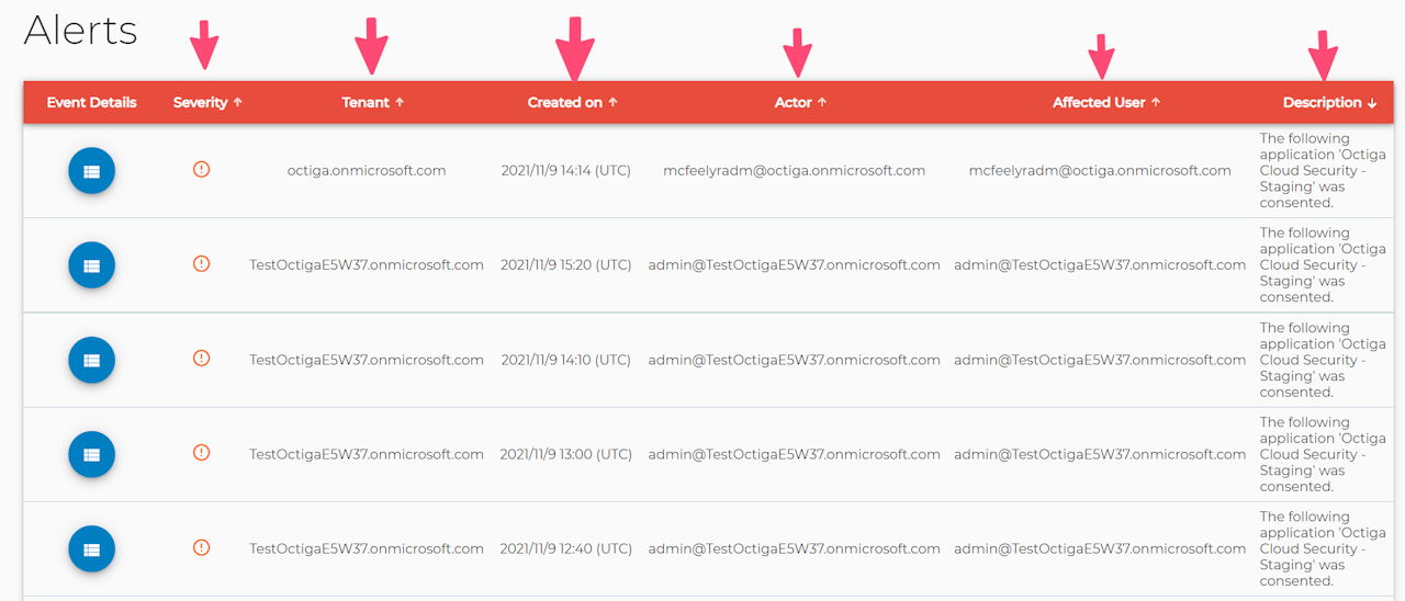 • Description.  A short description summarising why the underlying event has triggered an alert.   Sortable alphabetically.